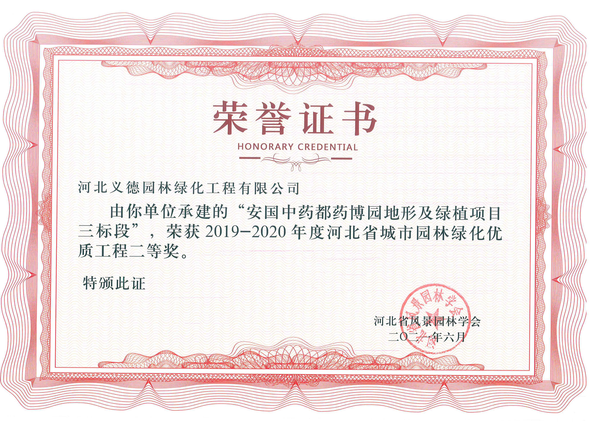 工程業績榮獲有2017-2018年度河北省城市園林綠化優質工程二等獎兩個;2019-2020年度河北省城市園林綠化優質工程二等獎兩個、三等獎兩個;2018至2020年保定市燕趙杯優質工程五個;2020年度石家莊市優質工程一個。